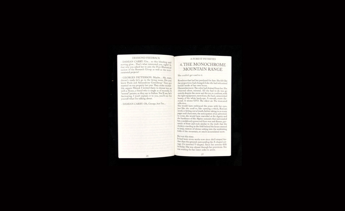 ABOUT A forest petrifies: Diamond Feedback is the first part of a larger novel in several episodes. Inspired by the Petrified Forest in Arizona and its ability to change over time from an organic to a mineral state, the story was concieved by the musician and artist Félicia Atkisnon over the past five years, while its on-going writing has been the starting point of many of Atkinson’s music lyrics and recent records and exhibitions.