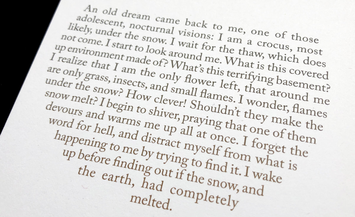 EXTRACT An old dream came back to me, one of those adolescent, nocturnal visions: I am a crocus, most likely, under the snow. I wait for the thaw, which does not come. I start to look around me. What is this covered up environment made of? What’s this terrifying basement? I realize that I am the only flower left, that around me are only grass, insects, and small flames. I wonder, flames under the snow? How clever! Shouldn’t they make the snow melt? I begin to shiver, praying that one of them devours and warms me up all at once. I forget the word for hell, and distract myself from what is happening to me by trying to find it. I wake up before finding out if the snow, and the earth, had completely melted.